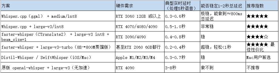 你有Mac(M系列芯片) → 优先 whisper.cpp,几乎无人能敌,实时延迟能轻松<0.8秒。