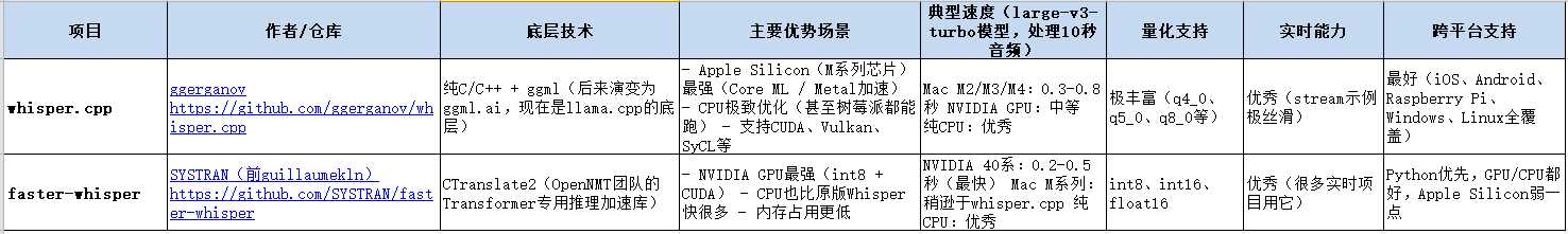 总结:它们就像“两条平行赛道”的Whisper加速版,一个走ggml/llama.cpp路线(whisper.cpp),一个走CTranslate2路线(faster-whisper),社区里经常互相拿来对比,但没有谁取代谁——只看你硬件用哪个更快更爽。
