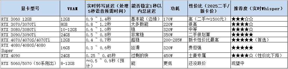 下面是2025年11月(当前日期)针对本地运行Whisper实时转写(large-v3-turbo模型,int8量化,实时流式)的NVIDIA显卡实际性能对比表。